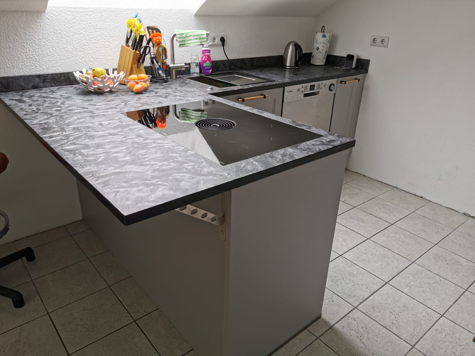 Besonderheit: Kochfeld mittig über Geschirrspüler und Schrank, um links etwas Platz zu generieren