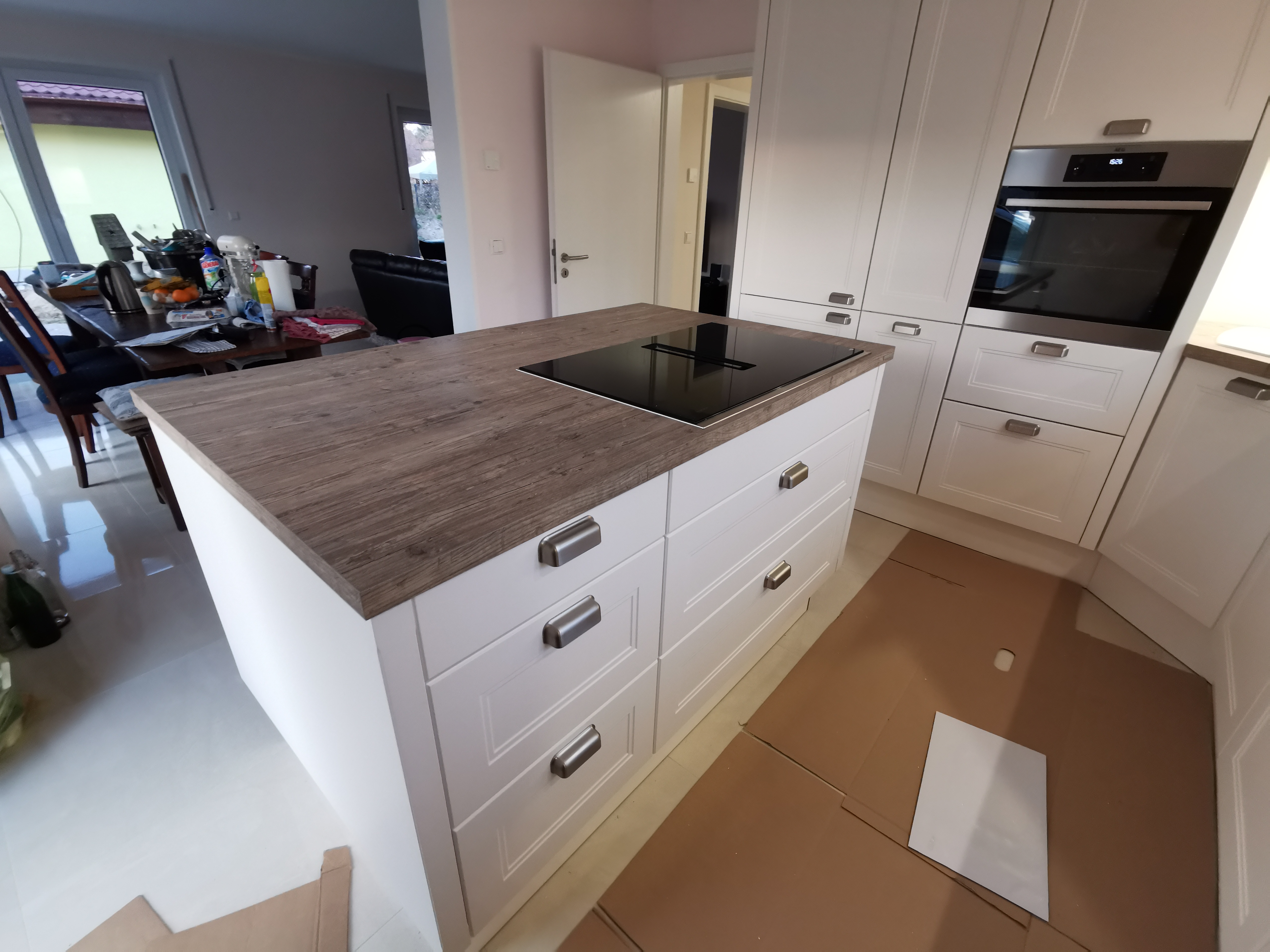 Besonderheit: Kochfeld mittig über Geschirrspüler und Schrank, um links etwas Platz zu generieren