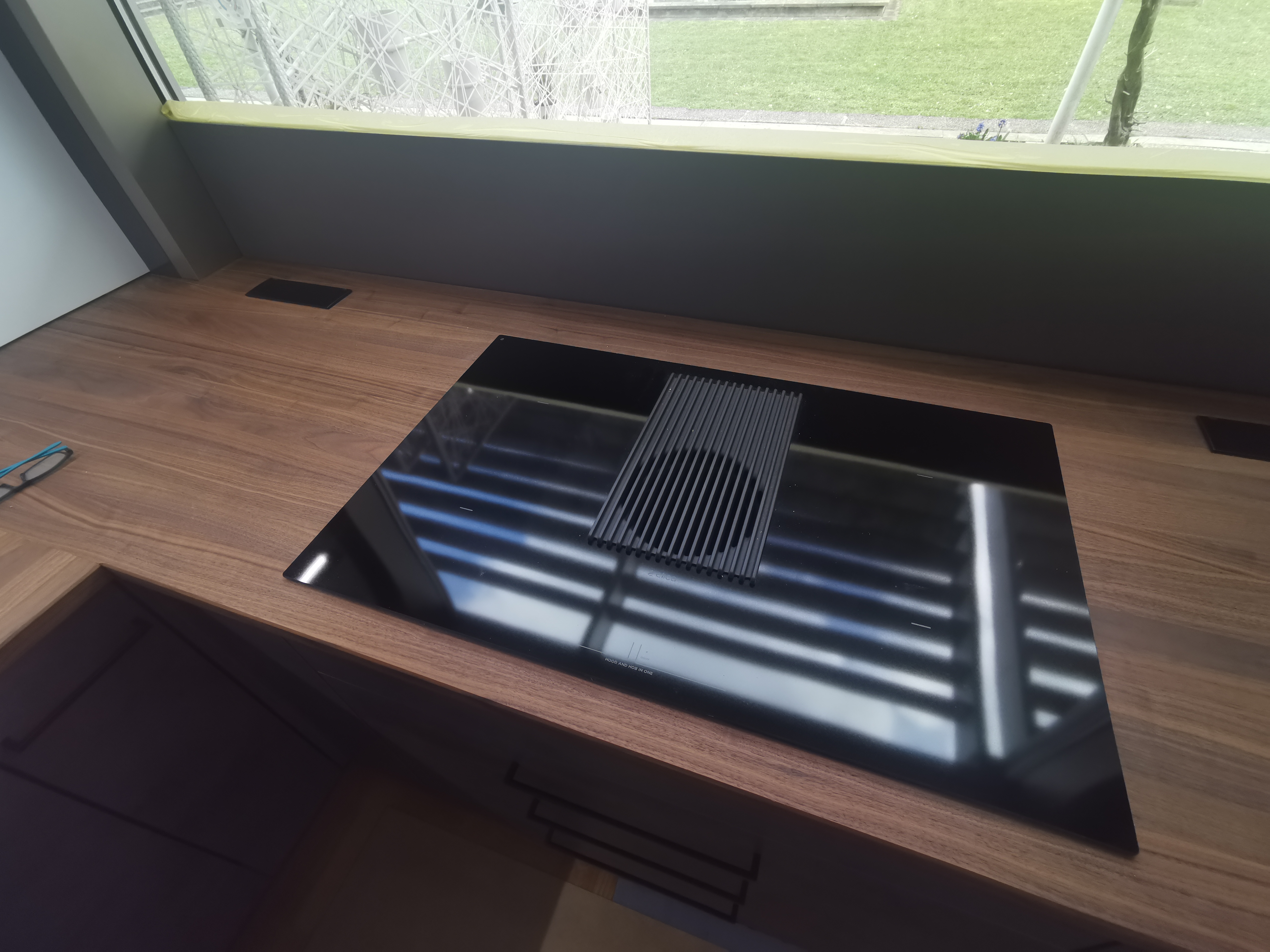 Besonderheit: Arbeitsplatte Nussbaum massiv, passend zum Parkett