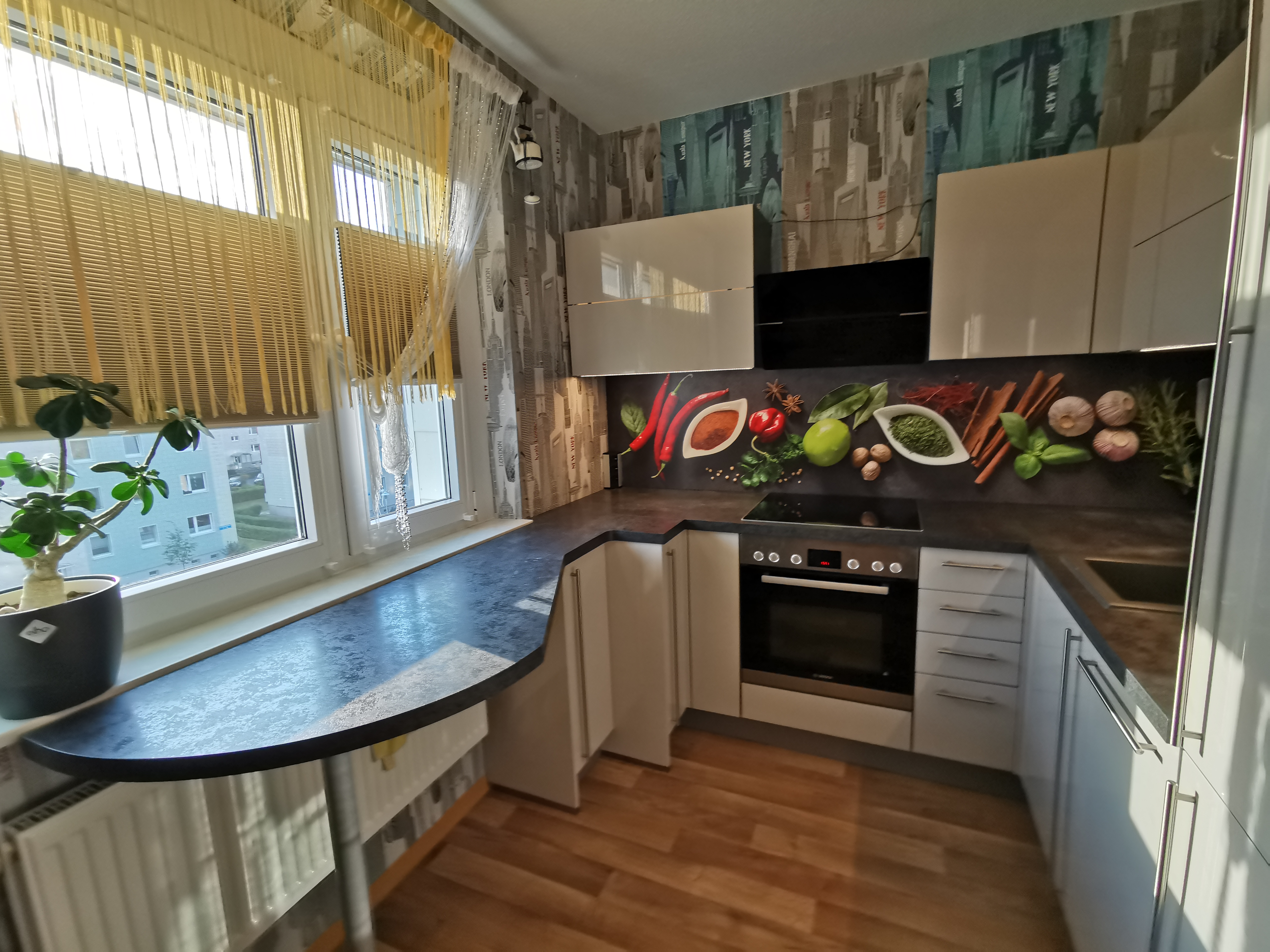 2021 Lichtenberg - kleine Küche, Kochfeld mittig über dem Geschirrspüler und ausziehbaren Arbeitstisch